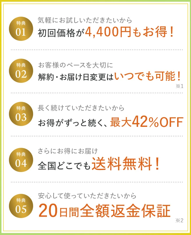 公式サイトの定期コースには20日間の全額返金保証が付いているため、初めて使う方も安心して試せます。